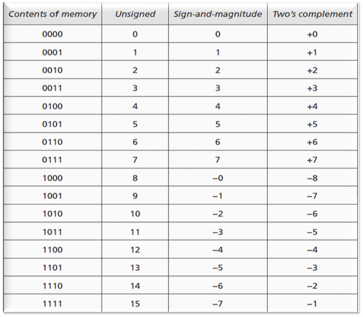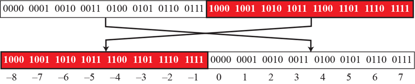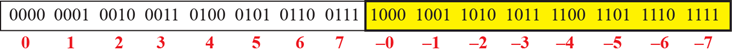 全部数据范围分为两个相等的子范围,前半个表示正整数,后半个表示负整数。最左位用于定义整数的符号。0表示正整数,1表示负整数。剩余位表示数字的绝对值。