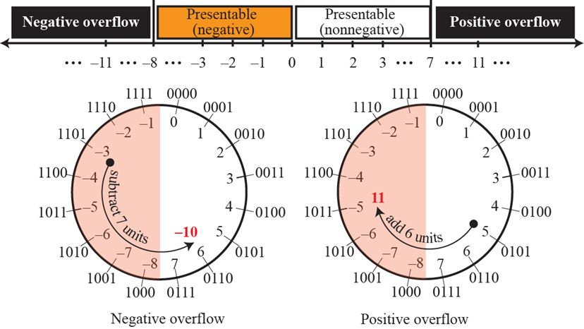 几乎所有的计算机都是用二进制补码表示法来存储位于n位存储单元中的有符号整数。最左位表示符号,0代表非负数,1代表负数。