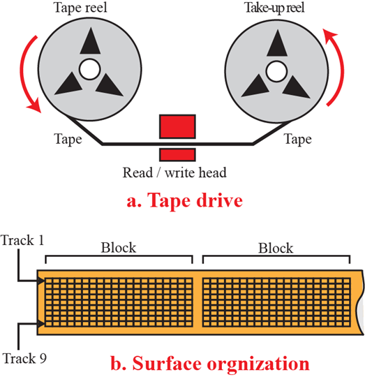 磁带采用顺序存取方式。用于存储大量数据。