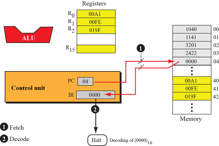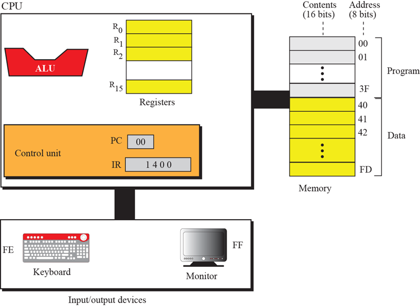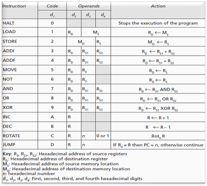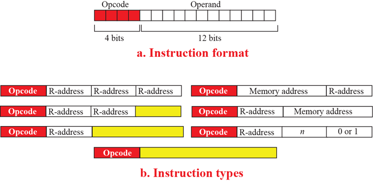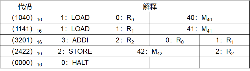 指令是16位,分成4个4位的域。最左边是操作码域,其它3个域含有操作数或操作数的地址。