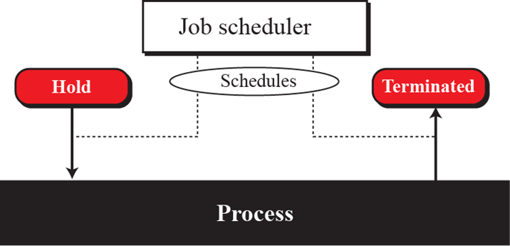 - 作业调度器:将一个作业从保持状态转入就绪状态,或是从运行状态转入终止状态。