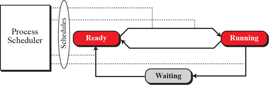 进程管理使用两个调度器,实现将作业或进程从一个状态改变为另一个状态。