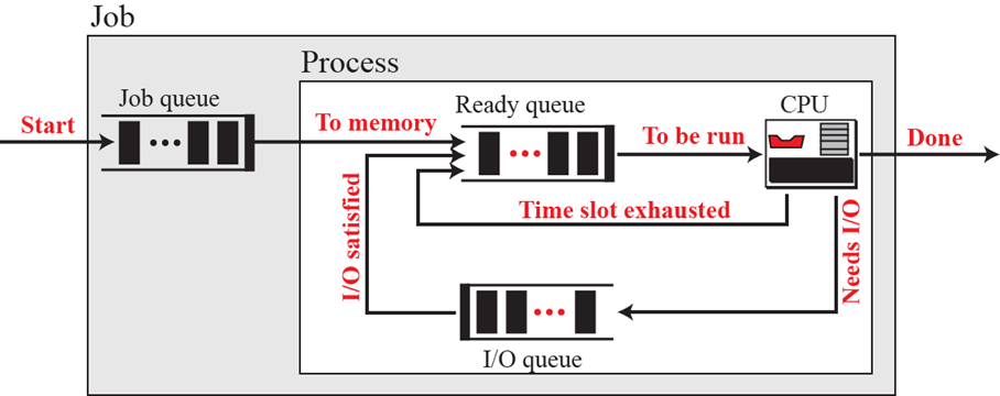 为了处理多个进程和作业,进程管理器使用队列进行协调。并根据一定策略选择下一个作业或进程来执行。