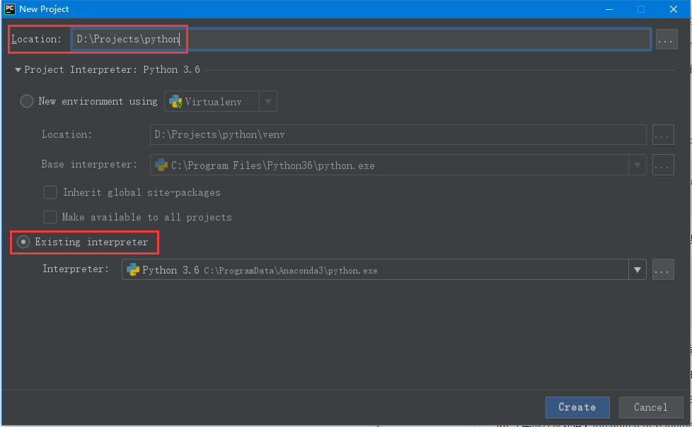 点击Create New Project,设置一个项目名称,选择已存在的解释器,然后点击Create: