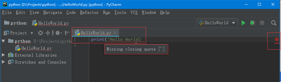 在一些IDE中,会集成代码语法与规范检查的功能,在PyCharm中,这一行以及这个文件会用红色波浪线划出,代表这里有错误:
